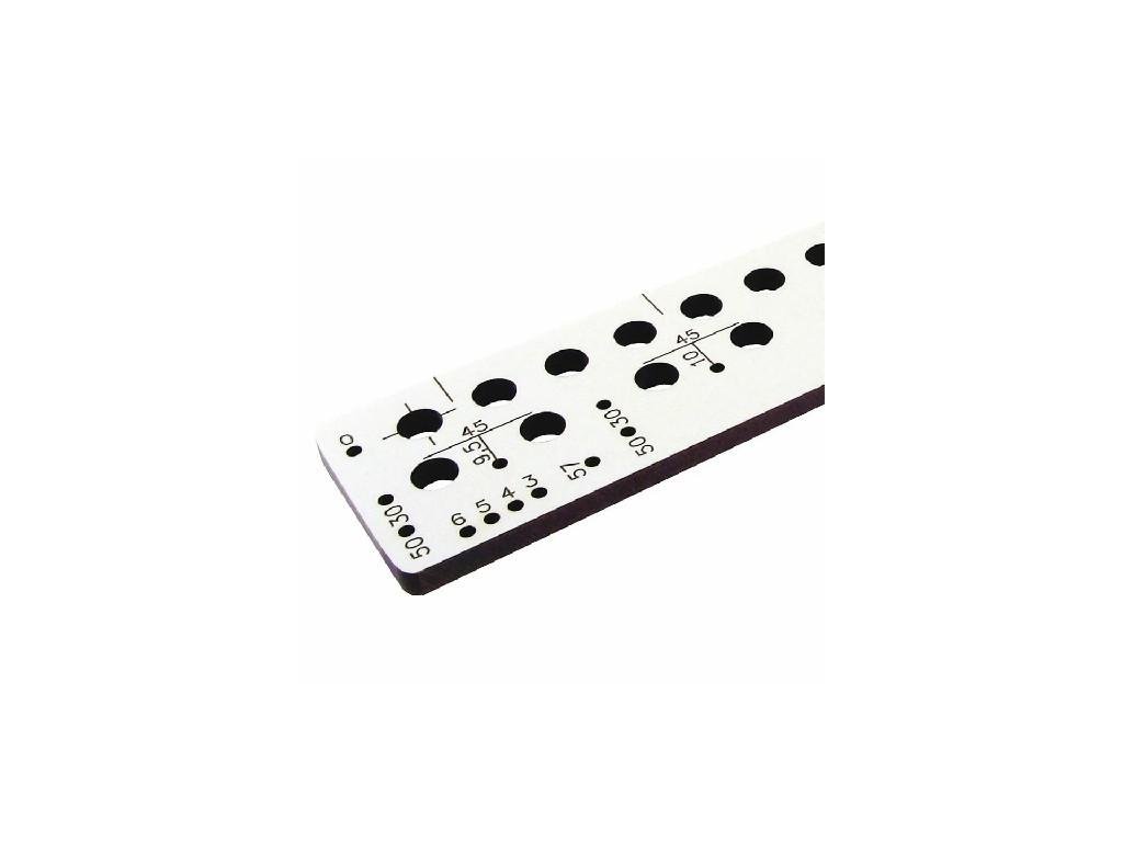 Na vŕtanie podpier políc používate hlavný rad otvorov v rozstupe 32 mm. Dorazy vám pomôžu šablónu presne zauhlovať a umiestniť do požadovanej vzdialenosti od okraja. Otvory pre podpery vyvŕtate v priemere 3 mm alebo 5 mm, podľa používaného typu. Veľkou výhodou je možnosť vyvŕtania viacerých otvorov v jednom rade na jedno upnutie prípravku. Šablóna je ideálna pomôcka na montáže a tiež výrobu.