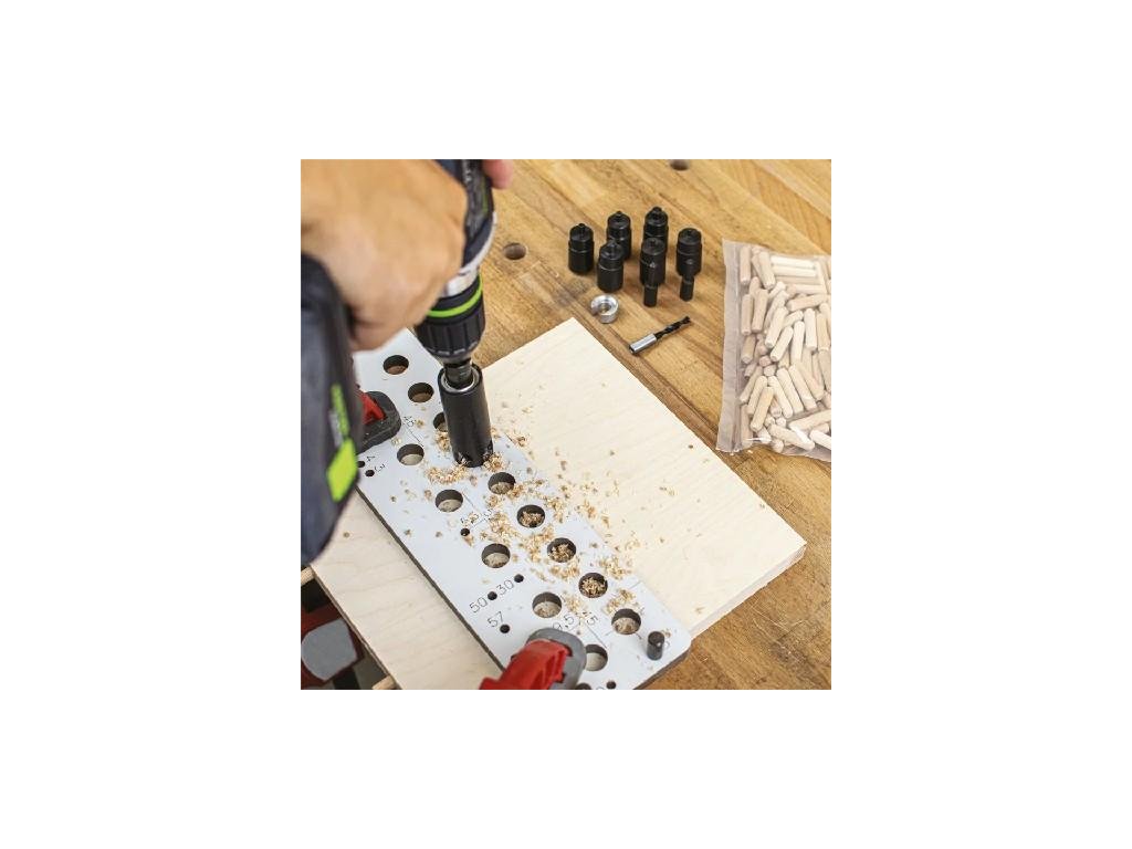 Práca so šablónou je veľmi rýchla. Na vŕtacom vretene nastavíte hĺbku vŕtania a upnete do vašej vŕtačky. Vložíte prípravok na dosku, opriete o dorazy a upnete svorkami alebo len pevne pridržíte druhou rukou. Vďaka kolíkovaciemu vrtáku s vodiacim hrotom a predrezmi vyvŕtate otvory jednoducho, presne a bez strapkania na okraji otvoru. Je to proste jednoduché a veľmi rýchle.