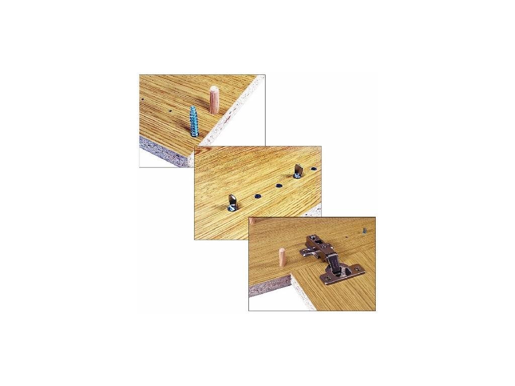 Podľa typu NK pántu, ktorý používate, zvolíte príslušnú zostavu otvorov (rozstup skrutiek a posunutie na stred misky, napríklad 45/9 mm) a zvolíte priemer vrtáka pre vruty alebo euro skrutky. Po zasadení dorazu do šablóny a umiestnení na dielec vyvŕtate otvory, stred misky pántu si označíte hrotom. Otvor pre NK pánt dovŕtate sukovníkom po odobratí šablóny z dielca. Takto vytvorené otvory sú vďaka šablóne v presnom rozstupe, presne do uhla a v požadovanej vzdialenosti 3 – 6 mm od okraja.