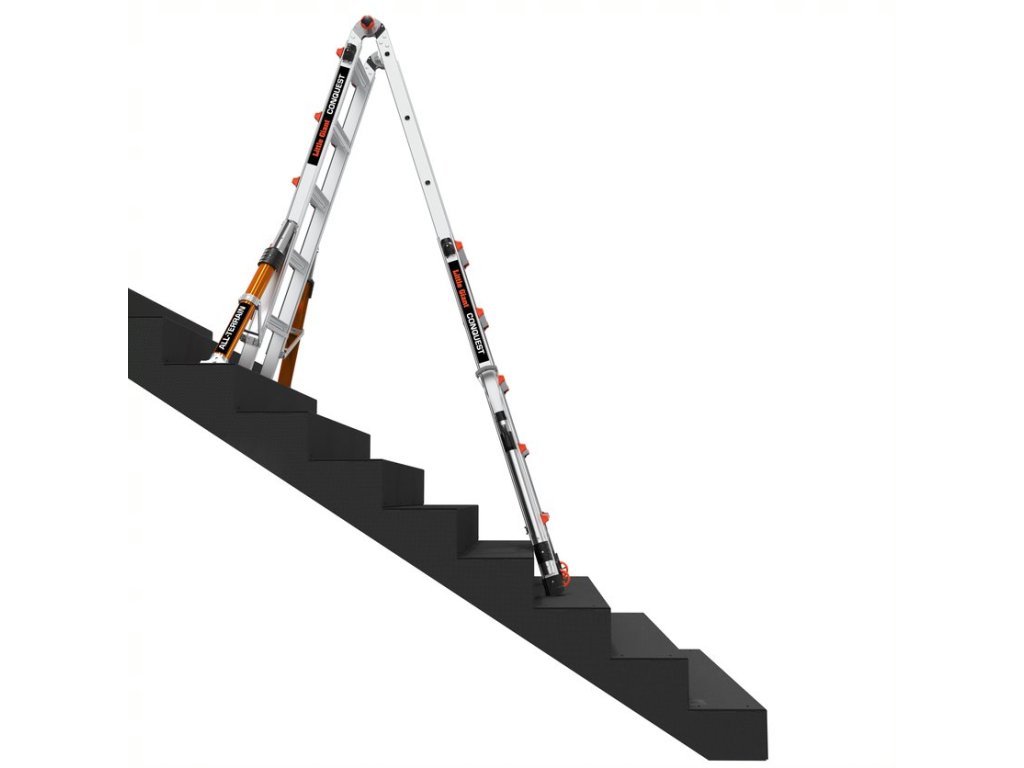 Samostatne stojacemu rebríku v konfigurácii A (štafľa) možno ľubovoľne upraviť dĺžku jednej strany tak, aby sa dal bezpečne umiestniť na schodisko.