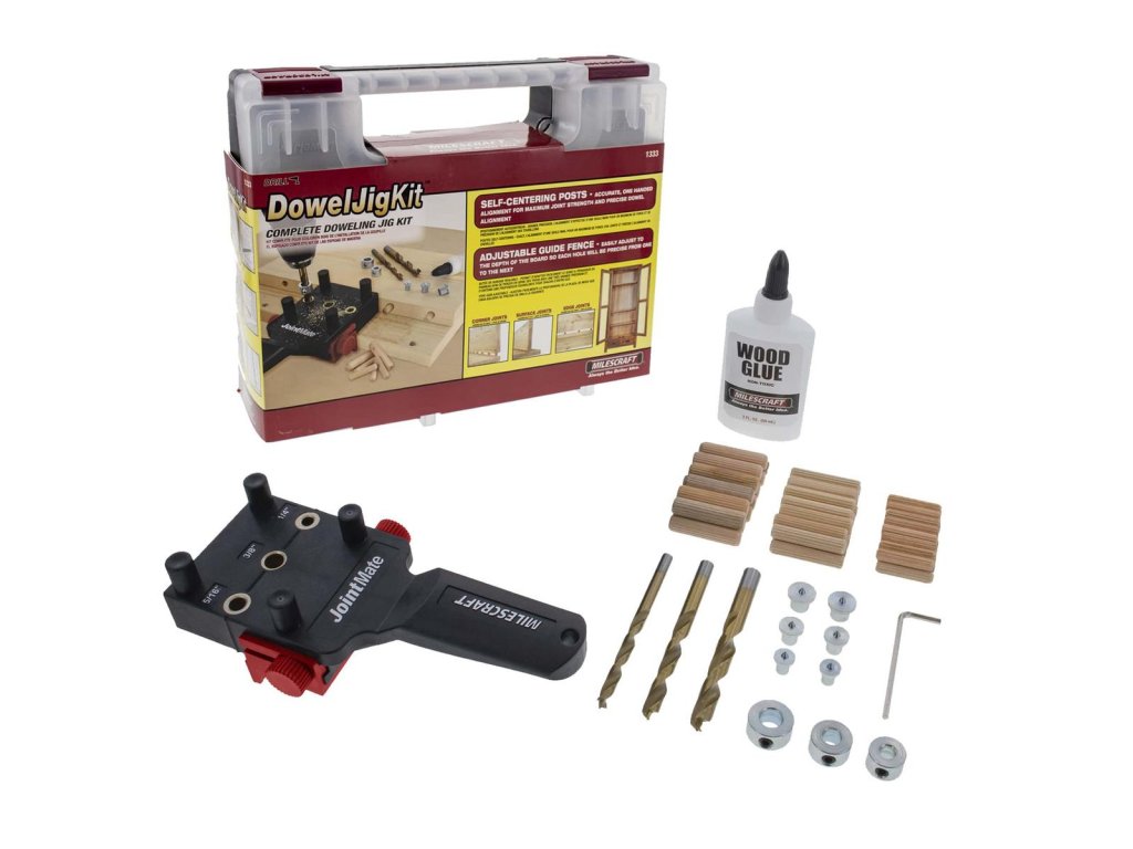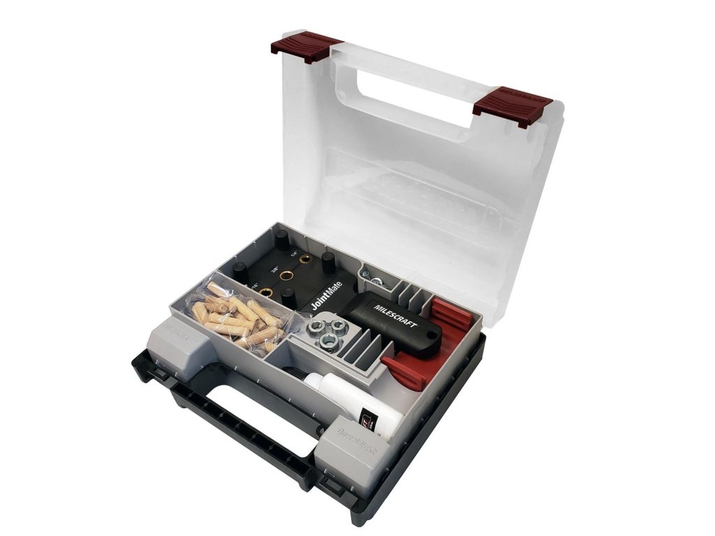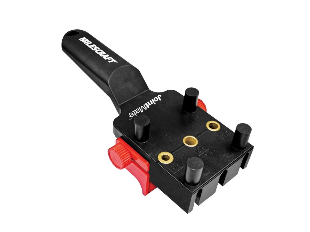 Milescraft - kolíkovací prípravok je pri použití na hrane materiálu samostrediaci a na vŕtanie do plochy je označený ryskou.