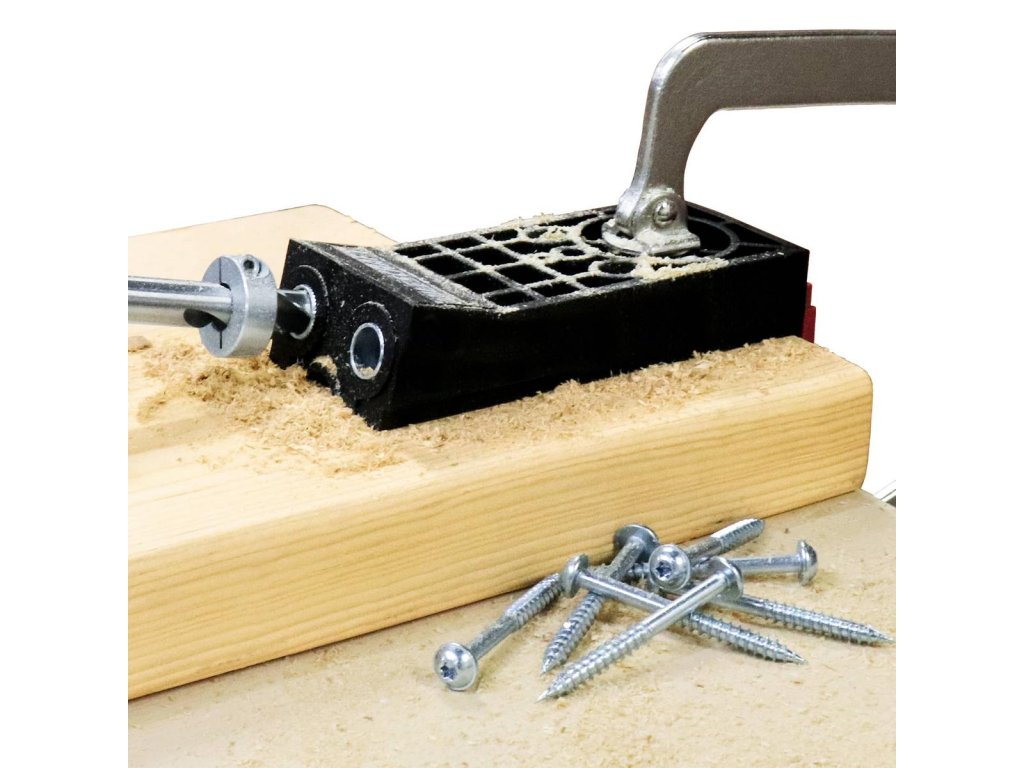 s 1/2" (12,7 mm) vrtákom a odolnými 2,5" (50 mm) dlhými skrutkami je tento prípravok určený pre materiály s hrúbkou 1-1/2" (38 mm) alebo hrubšie