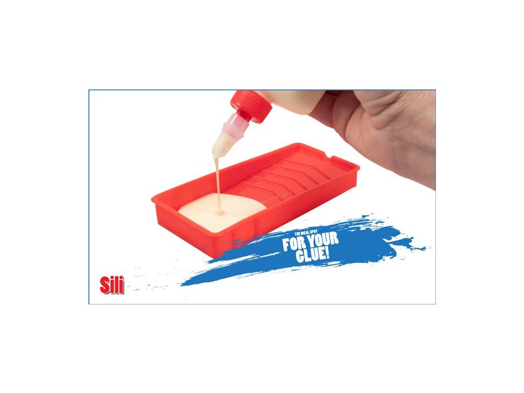 - Zásobník Sili, je vyrobený výhradne zo silikónu a pripomína zásobník maliarskeho valčeku, ale v menšom meradle, a je flexibilnejší, čo umožňuje jednoduché naliatie lepidla späť do nádoby po dokončení práce
